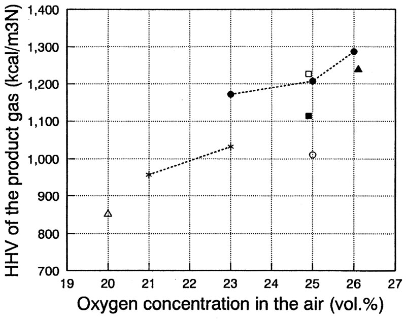 Heating value of the product gas increases by the enrichment of air (gasifying agent) with oxygen. Relationship between oxygen concentration