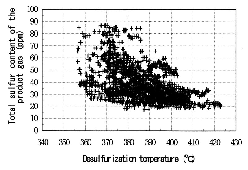 sharply drops at the outside of the appropriate temperature range. Therefore target concentration of sulfur (HQS+COS) at the desulfurizer outlet
