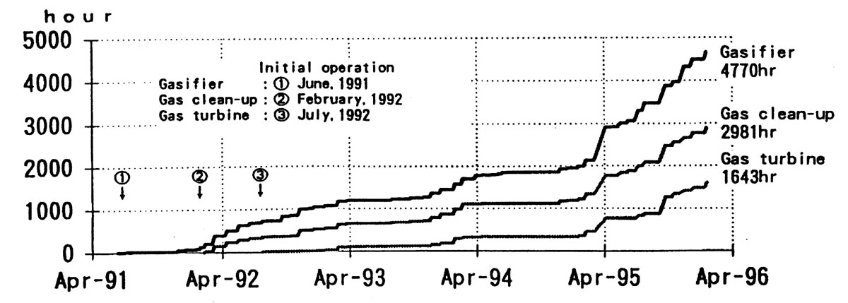 Cumulative operation hours of each facilities during 5 years from June 1991(first Btu) to February 1996(final run) are shown in Table 1. Profile of