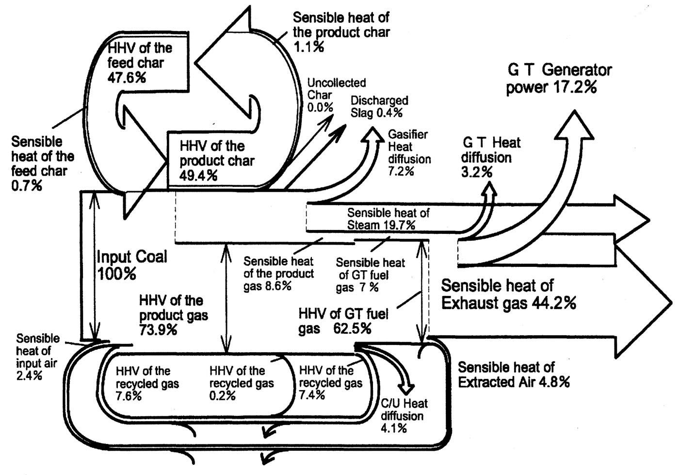 Char in the product gas is recovered and recirculated to the combustor chamber of the gasifier. Ash in the coal pours into the bottom of the gasifier