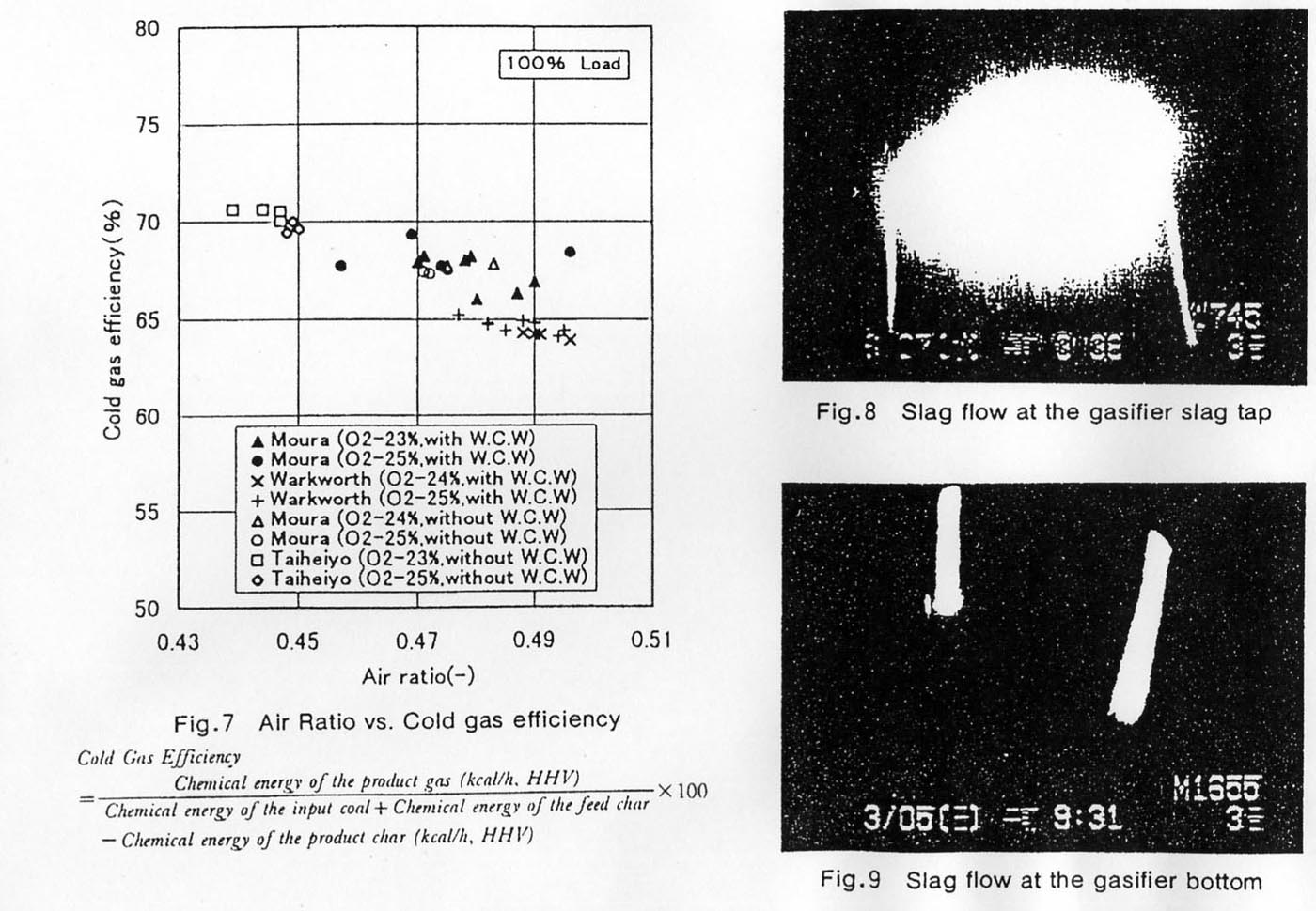 during test operation, they were perfectly solved by modifying the profile of the gasifier. Tests on three coals(domestic Taiheiyo coal, Australian Moura