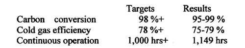 . Targets of carbon conversion rate (98%+) and cold gas efficiency(78%+) were achieved simultaneously. Problems due to ash component
