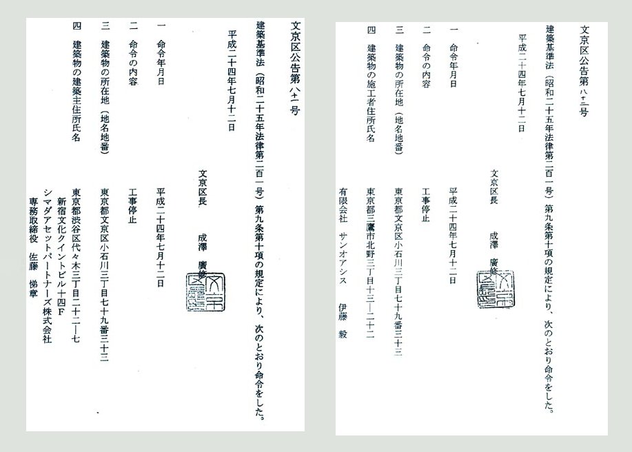 「文京区公告第81号(工事停止命令・建築主)」及び「文京区公告第82号(工事停止命令・施工主)」