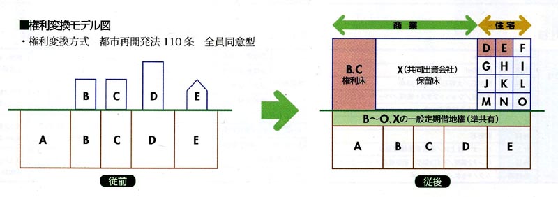土地はそのまま(土地から土地への権利変換)で、その上に公的支援が受けられる町づくり会社が建物を所有する(全館保留床)。