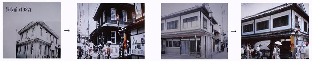 滋賀県の長浜では、黒壁地区にある建物(写真 下左、1987年)の保存運動が始まった。この建物は、栄えていたときには町のシンボルであったが、