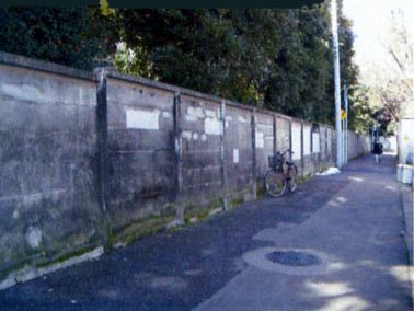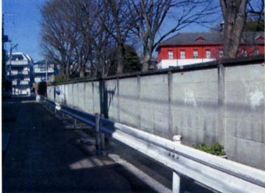 上側の塀(写真@)が古くて危ないので建替える話が最初に持ち上がった。また、下側の低い方の塀(写真A)を改修して道路を拡げようという計画を区が出した。(その発端は、