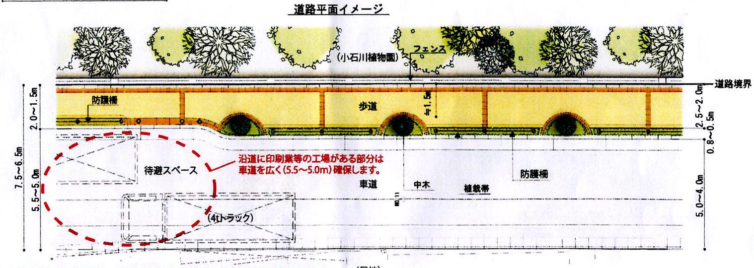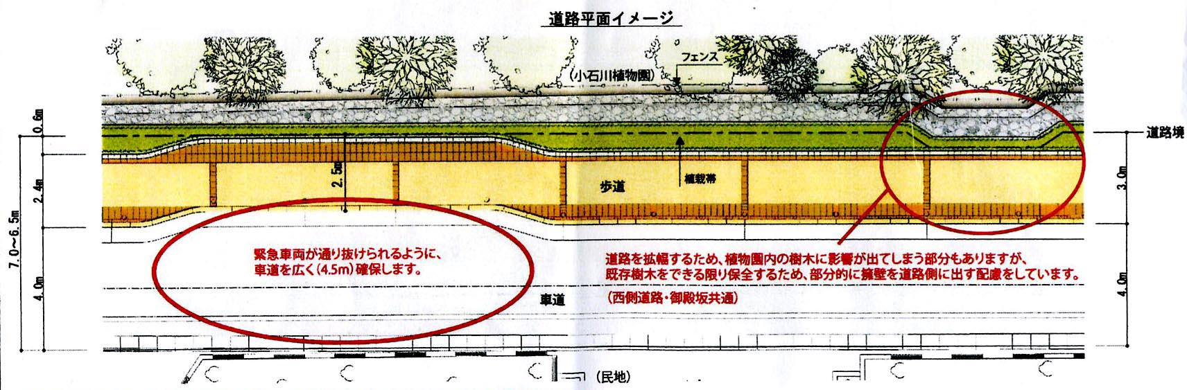 計画になっている。道路を植物園側に拡幅すると緑が減ってしまうので下図のように歩道の車道側に植林をするという変則的なものになっている。