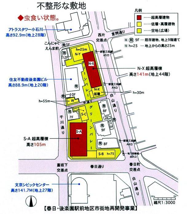 第一街区、第二街区とに分けて、第一街区は所有者1人の再開発とした。これによって最も得をしたのは都の交通局である。奥の窪地を移して変形の土地整形ができ、春日通りに面する部分