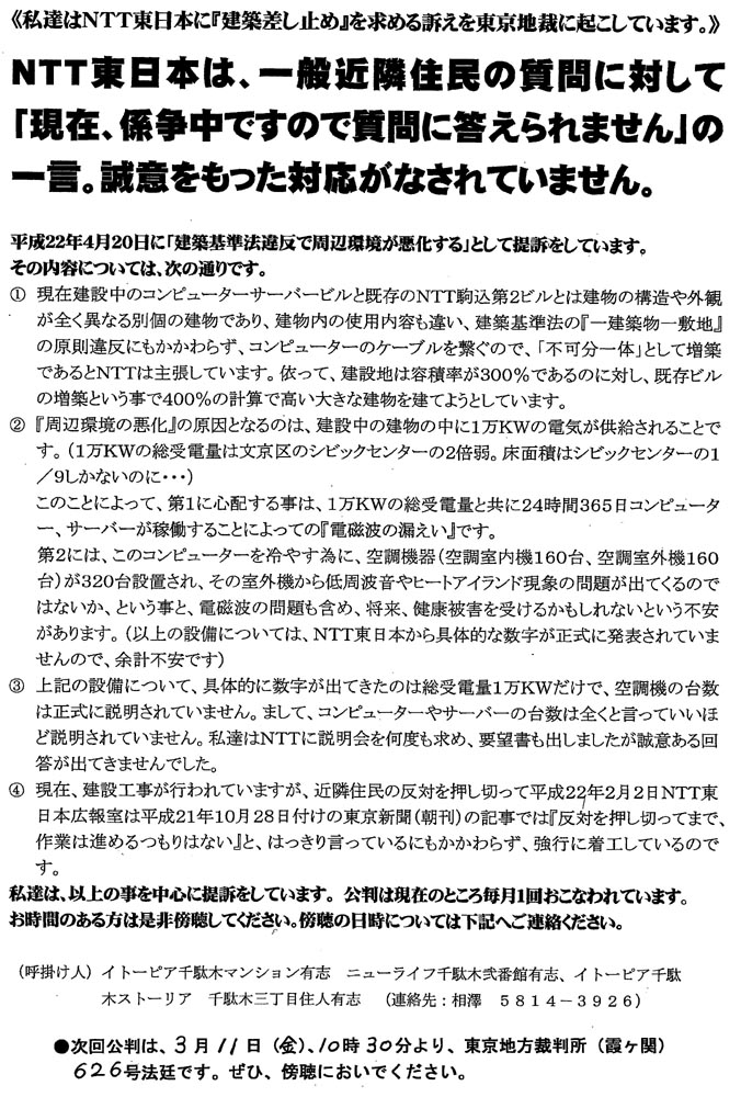 実際は無人で工場のようだとも言われている。このサーバーを冷やすため、365日、24時間稼働する室外空調機が160台ビルの上にのることが明らかになった。原告団は、不忍通り