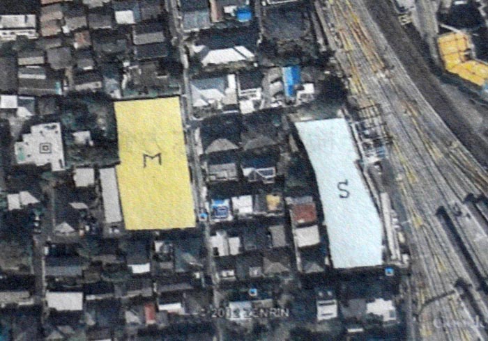 三菱の方は高台平地にあるが、住友の方は崖下にある。工事用車両の経路は住友は右のメトロ沿いに入ってゆき、三菱は左側の細い道沿いで