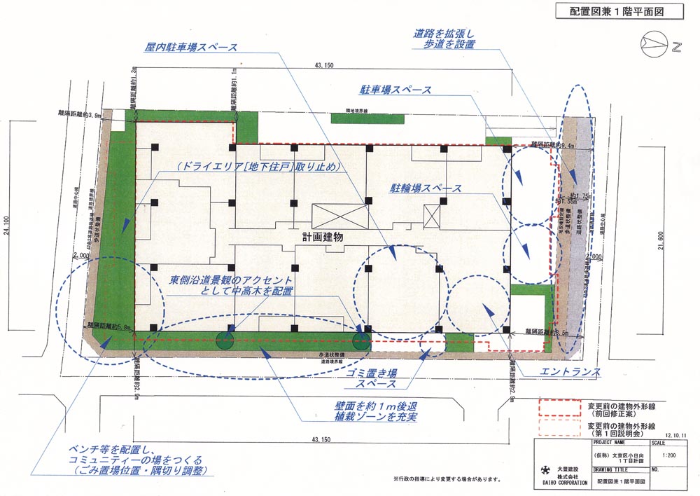 住民側の要望をかなり取り入れた全面見直し案を持ってきた。この案では、建蔽率を70%から60%に下げ、建物北側をカットし、地上の駐車場に