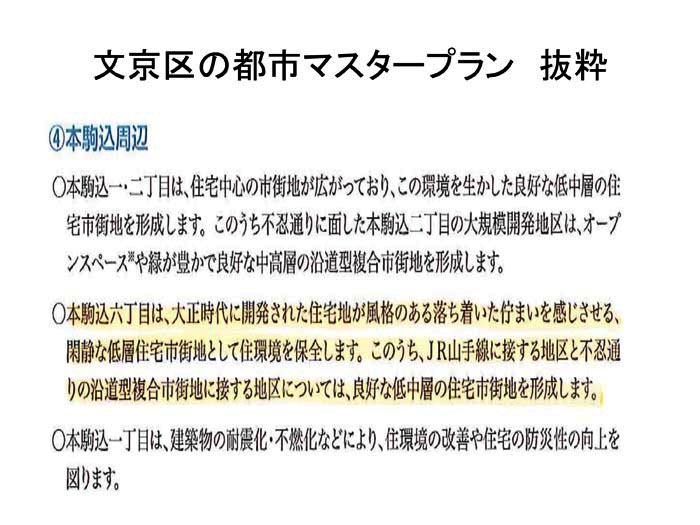 文京区の「都市マスタープラン」では、本駒込地区は、低層住宅地が夢であるが、大和郷自体は商業地区も含んでいるので、