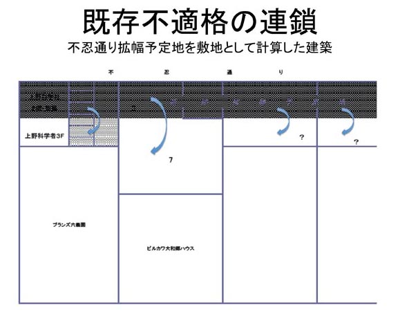 道路拡幅が完了した場合、この丸紅ビルの敷地には、ごくわずかしか隙間がなくなる。建蔽率80%のところであるが、道路がなくなった場合の建蔽率は93%になってしまう。