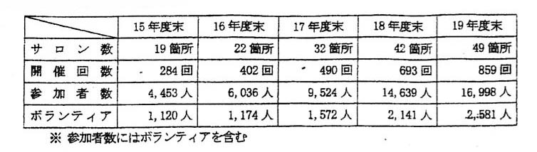 <ふれあいいきいきサロン> 地域住民が主体となり、年寄り、障害者等へのたまり場を提供するもので、8年前から実施している。現在50サロンあるが、この内30が高齢者用である。 月2回まで、2,000円/回の援助をしている。サロンの設置・運営者、スタッフの情報交換会も実施している。