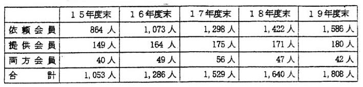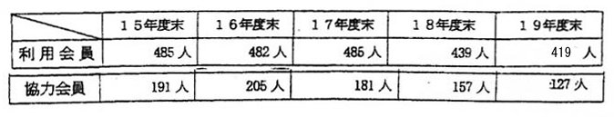 介護保険以前の人を対象として、掃除、弁当などのサービス(有償)をしている。協力会員には時給900円が払われるが、下表のように利用会員数に 比べて協力会員数が少ない。協力会員数は、利用者数と同じ位が望ましい。