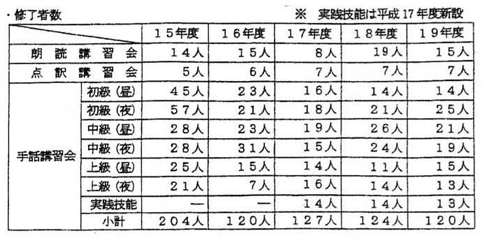 手話講習は、文京区が全国で一番大規模に行っている。S61年から実施しているが、3クラスに分かれ年間38回もの講習がある。なお、 受講料は無料(テキスト代のみ必要)である。