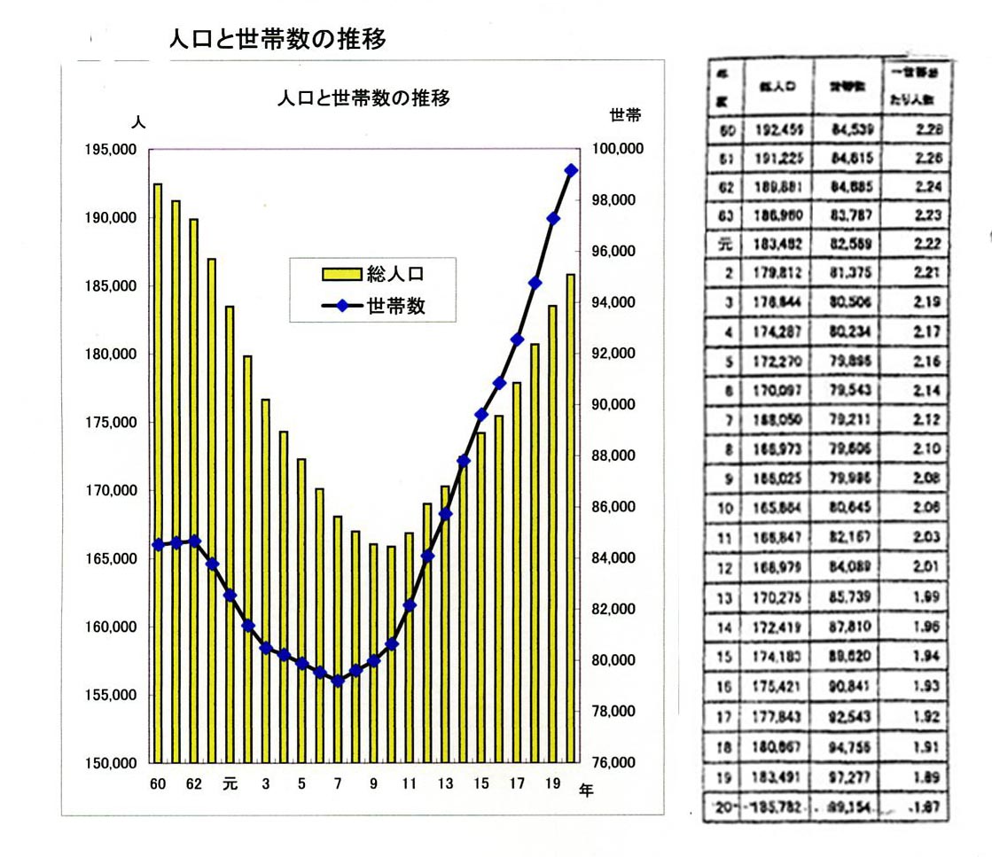 文京区の所帯数は、下図のごとく昨年5月、10万を超えたが、核家族化の進行により一世帯当りの人数は、1.88人まで下がった。なお、