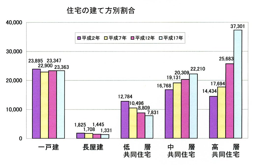文京区の住宅を建て方別にみると、下図のごとく十数年前には40%位だったマンション居住者の比率が急増し、現在64.7%に達している。
