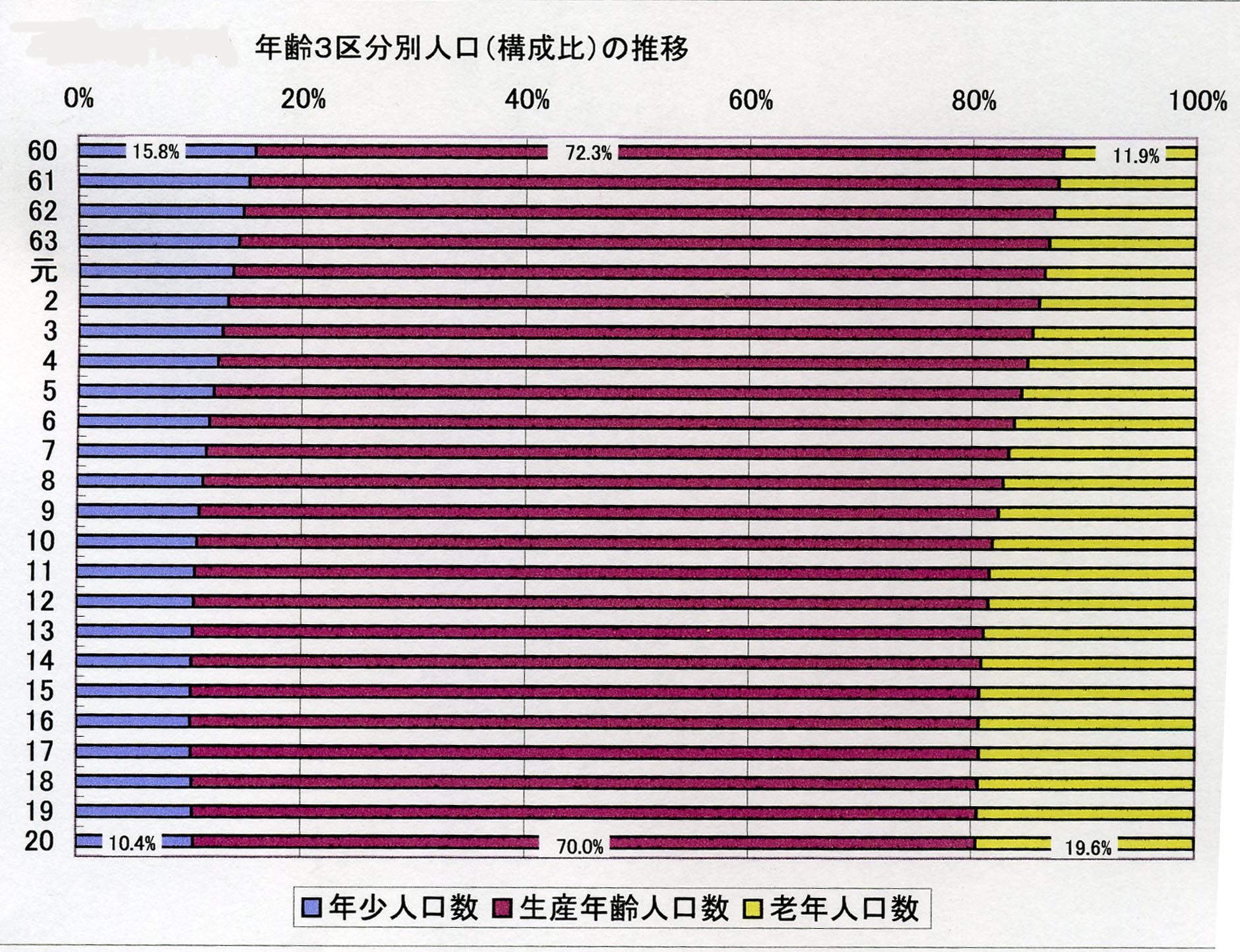また、下図のごとく高齢化率は、現在19.7%であるが、人口増が比較的若い人によっているため、若干改善のきざしもある。