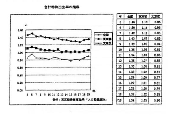 一方、文京区の出生率は、近年若干上昇し、0.90であるが、これは全国1,700自治体の中でワースト・テンに入る。