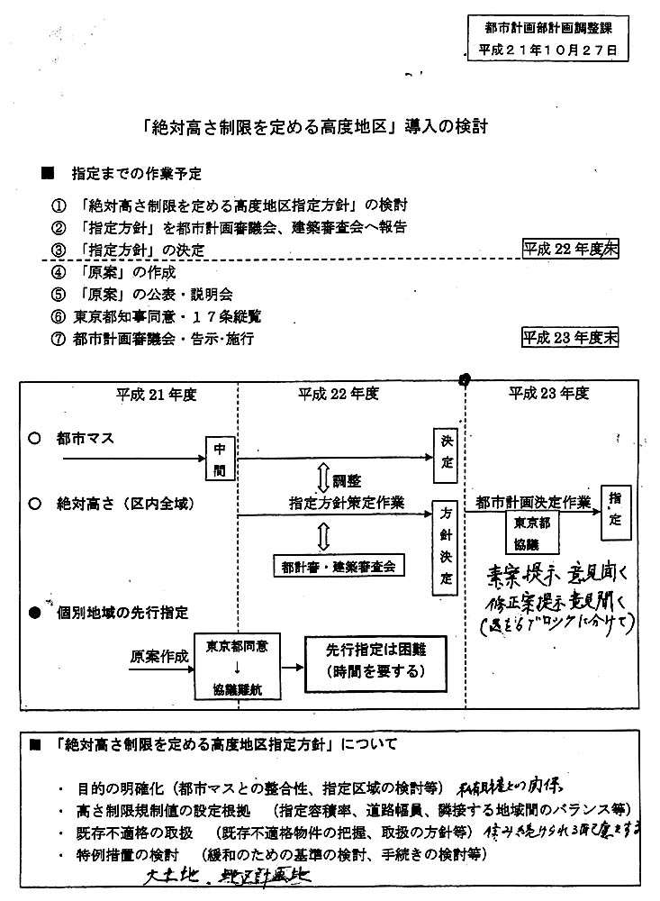 「絶対高さ制限を定める高度地区」導入の検討過程は配布ブロック図のとおりとのこと。