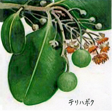 オトギリソウ科、テリハボク属の常緑高木。別名「タマナ」。葉はゴムノキに似ていて、大きく厚く、光沢がある。実は2-3cmの球状で、 海水に浮かんで分布を広げる。父島の海岸近くには、巨木となったテリハボクが多く見られる。沖縄では、主要な街路樹の一つである。